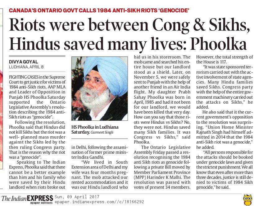 2017 Paper clipping of Indian Express, H.S Phoolka said ‘Riots were between Congress & Sikhs, Hindus saved many lives’.