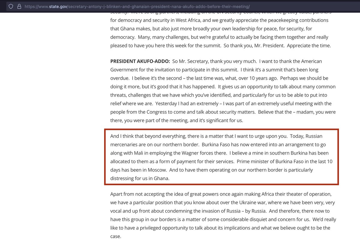 Ceci étant, le président du Ghana Nana Akufo-Addo a affirmé, hier lors d'une conférence de presse avec Antony Blinken, que le Burkina avait un arrangement avec le groupe Wagner, avec présence au sol. state.gov/secretary-anto…