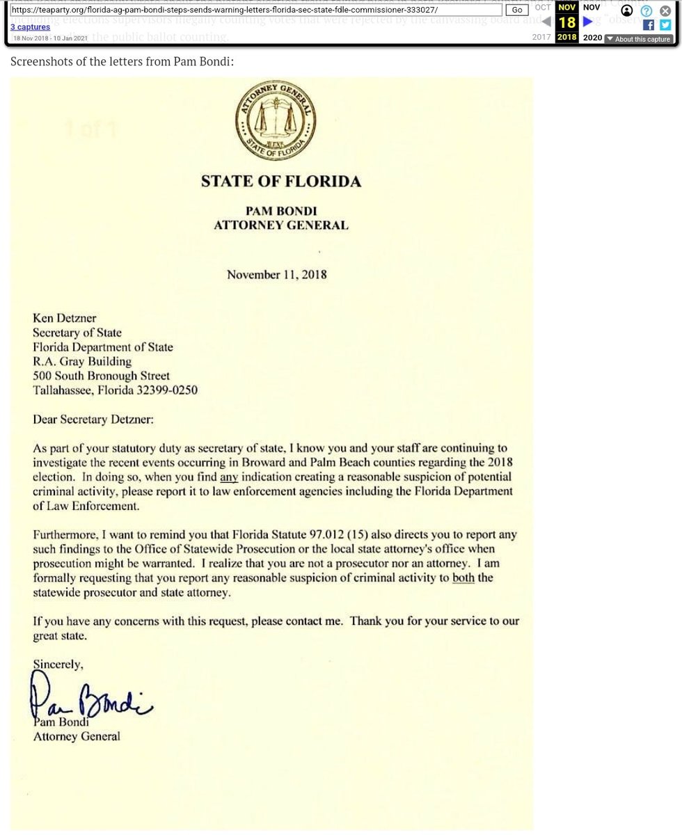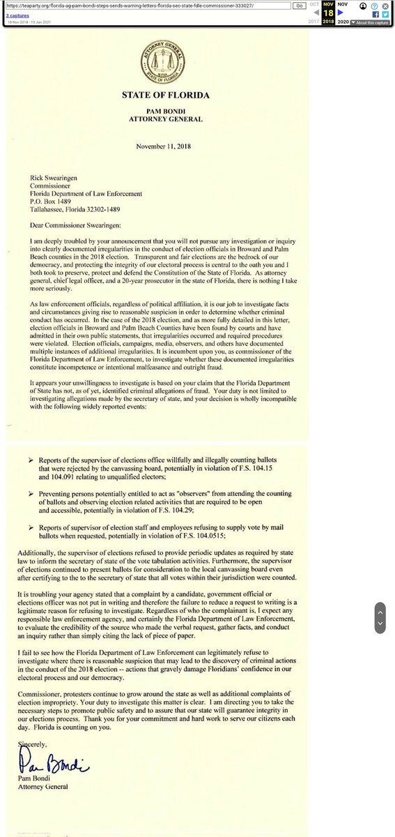 Saying she's “deeply troubled” by his FDLE not pursuing investigation in the conduct of elections supervisors Brenda Snipes & Susan Bucher. web.archive.org/web/2018111818…