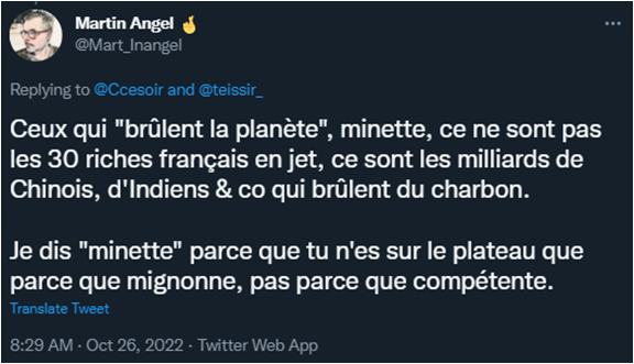 Notons également que souvent, ils adorent accuser les Indiens et les Africains, la surpopulation, etc. L'indien a en moyenne une empreinte carbone annuelle plus de 4x inférieure à celle d'un Français, mais quand on est raciste (et parfois misogyne), les chiffres vous savez...