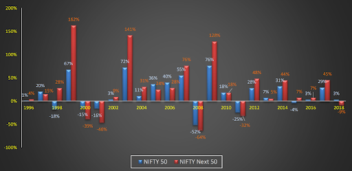 Performance of Nifty Next 50 and Nifty 50 over the years