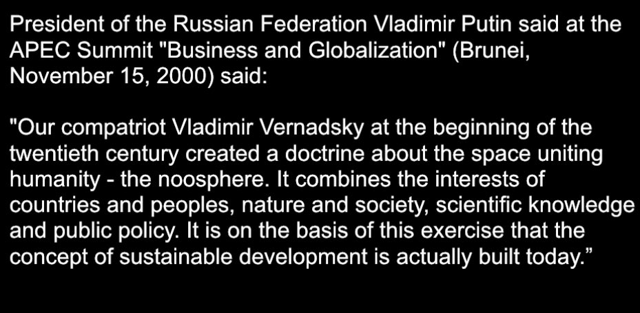 3/Putin declared Vernadsky’s “Noosphere” concept as the basis for “sustainable development” at the APEC summit in November 2000.