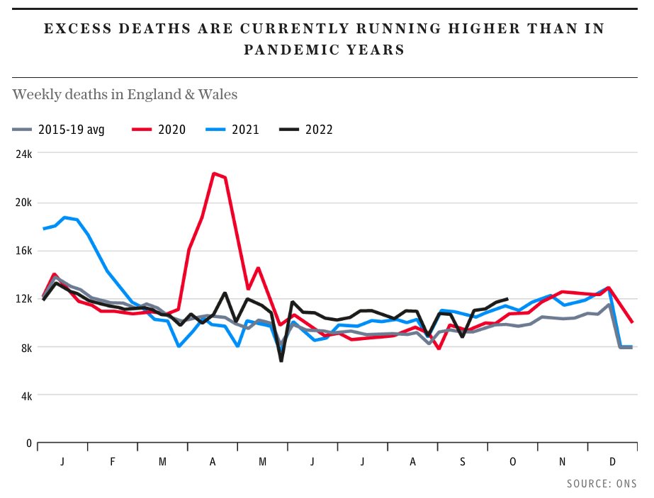Throughout October, there was an average of 1,564 extra deaths per week, compared with a weekly average of just 315 in 2020 and 1,322 in 2021