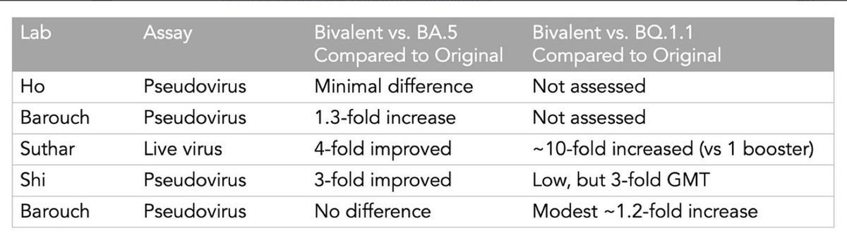 5/ Bivalenter Booster führt zu mässigen aber signigikant höheren Ak-Titern gg BA.5 und seine Abkömmlinge als der WT-Booster (die Tendenz ist trotz der Unterschiede zwischen den Studien eindeutig). Tabelle von @EricTopol