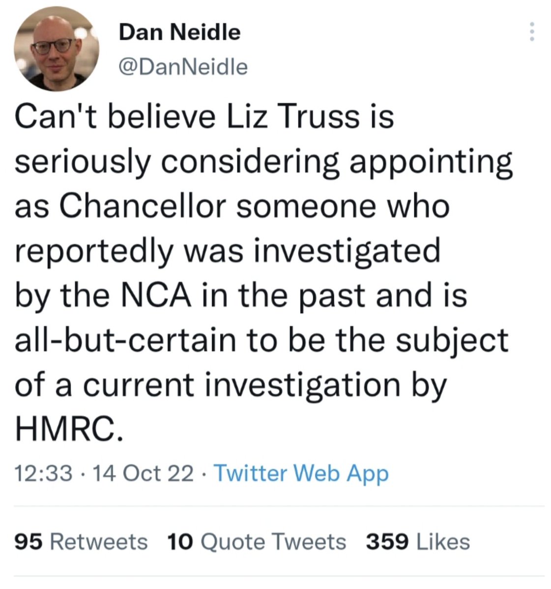 Can't believe Liz Truss is seriously considering appointing as Chancellor someone who reportedly was investigated by the NCA in the past and is all-but-certain to be the subject of a current investigation by HMRC.
