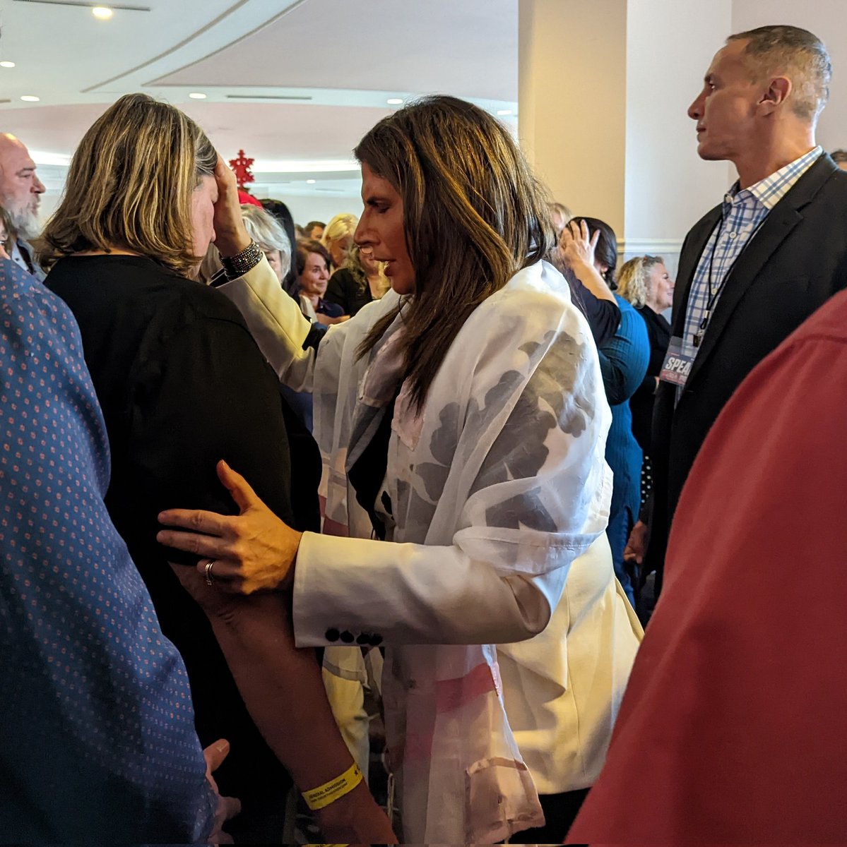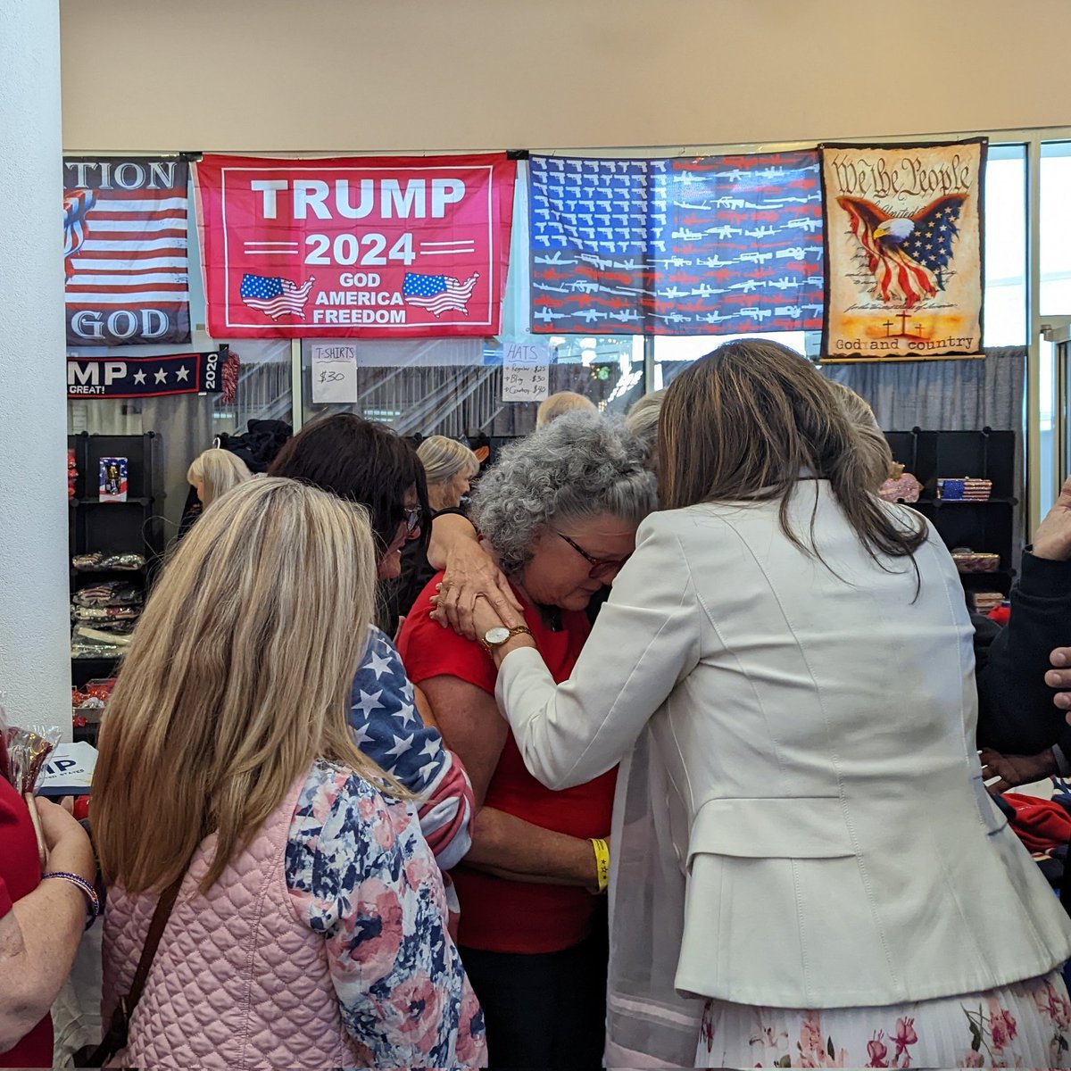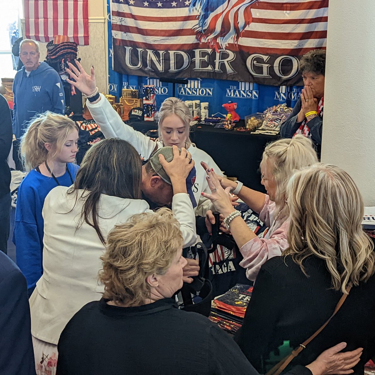 Since not everyone has time to get prayed over during main session, "prophet" Amanda Grace & others went out in lobby to continue praying over people ... in front of Trump store.