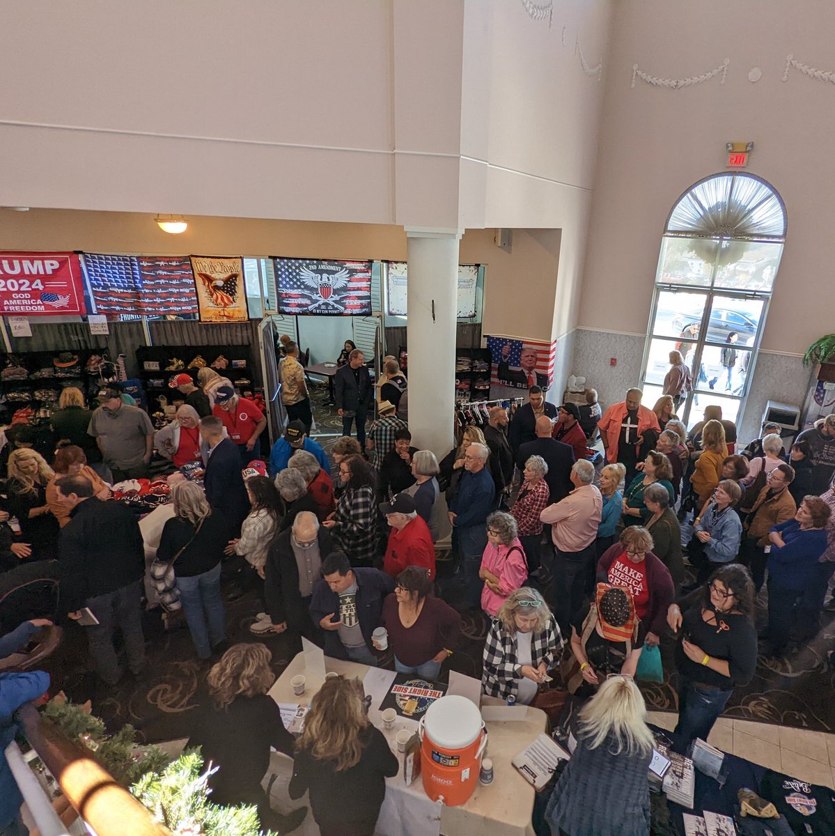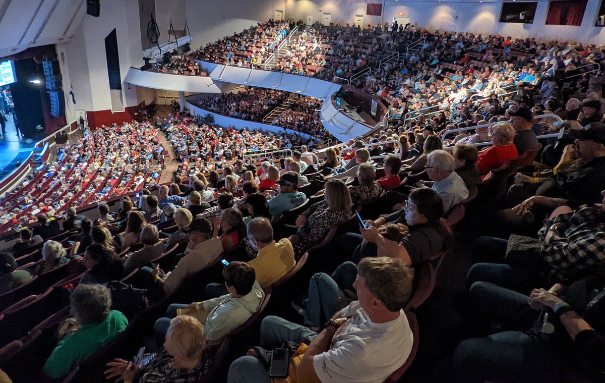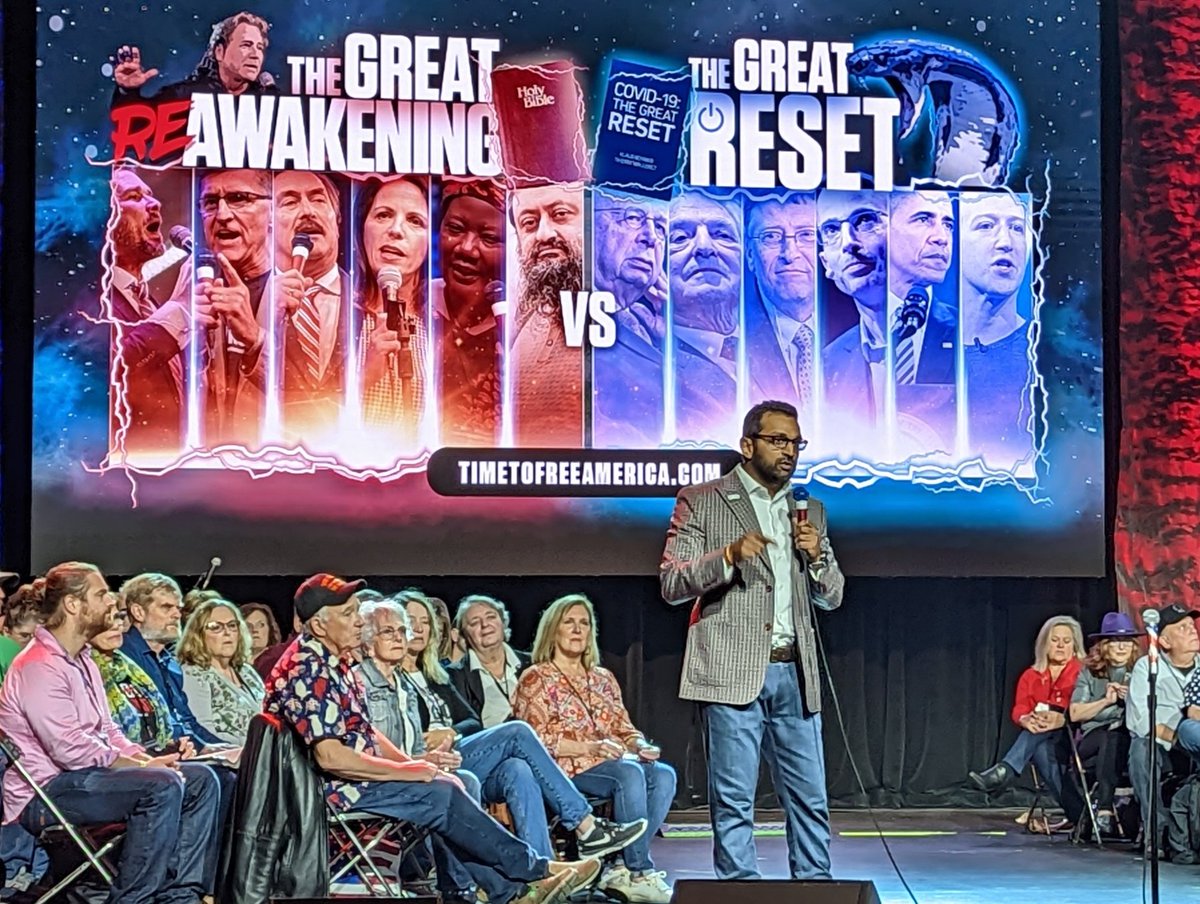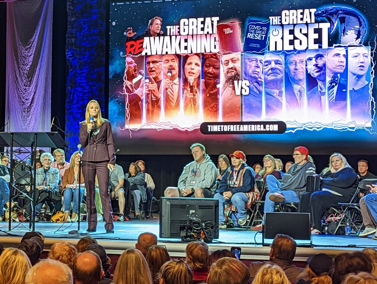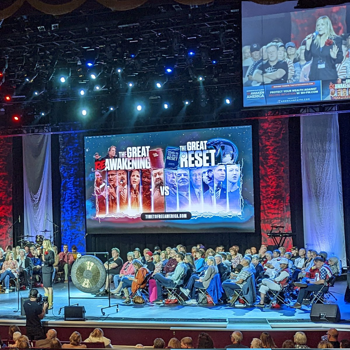 ReAwaken America in Branson being held in 3,000-seat theater & it's pretty packed even as some people have left seats to get concessions or shop for books, shirts, etc