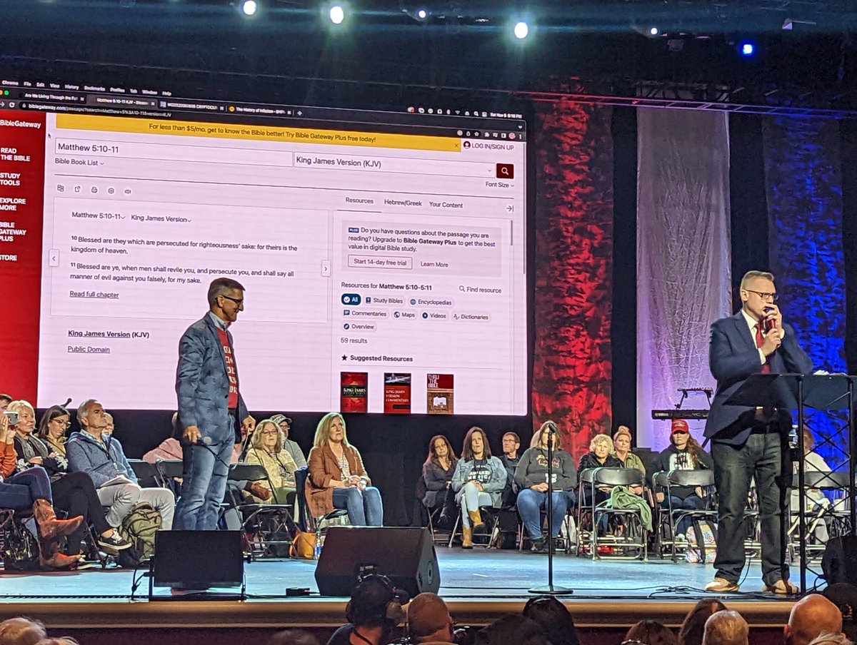 Michael Flynn Clay Clark at ReAwaken America frame their political work as part of spiritual battle for Jesus (with Bible verses on screen).