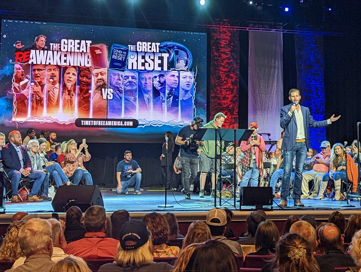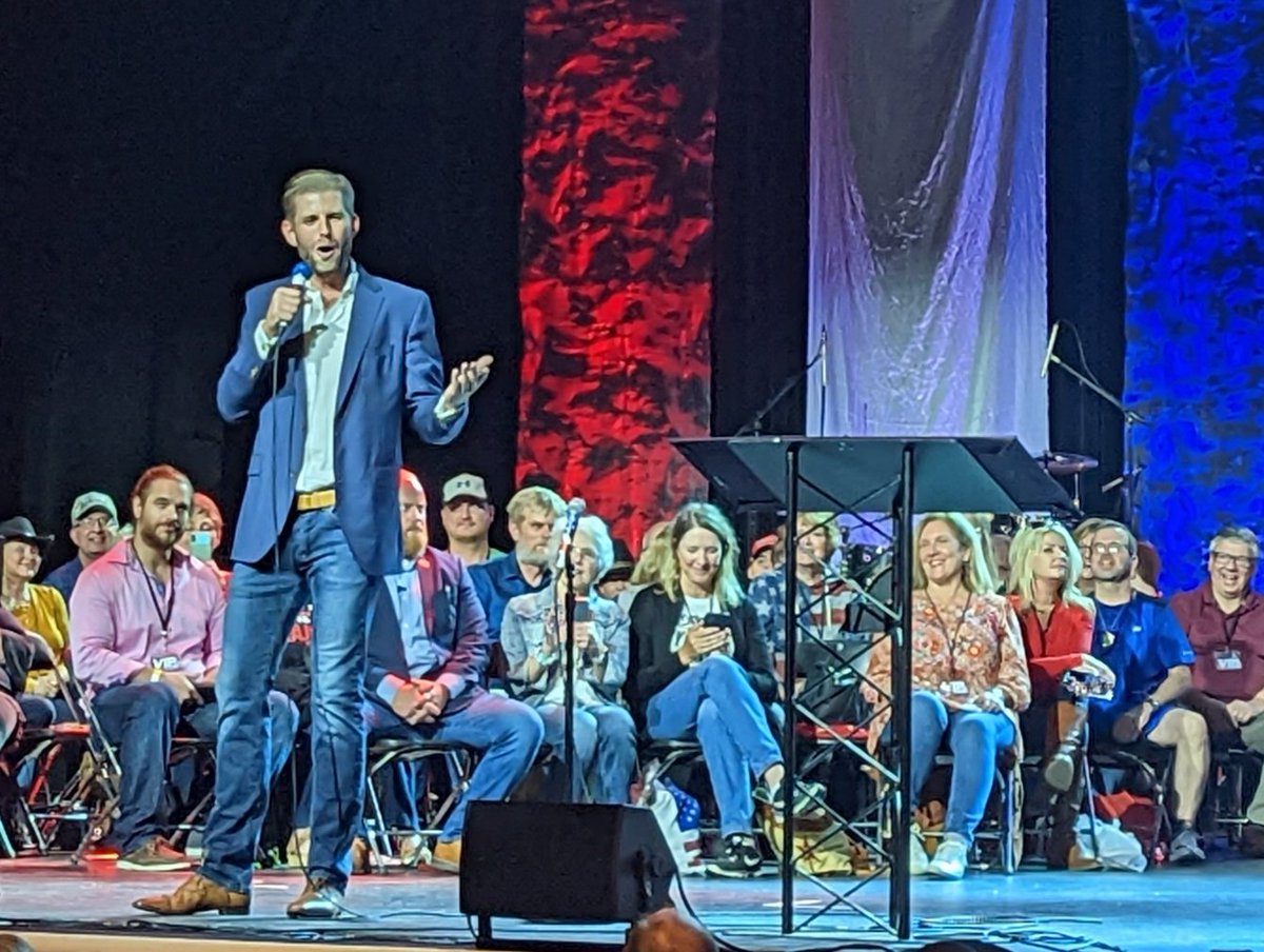 Eric Trump speaking at ReAwaken America. Claiming his dad won in 2020 & will come back. Also complaining about Mar-a-Largo search.