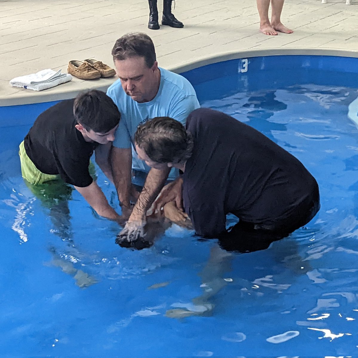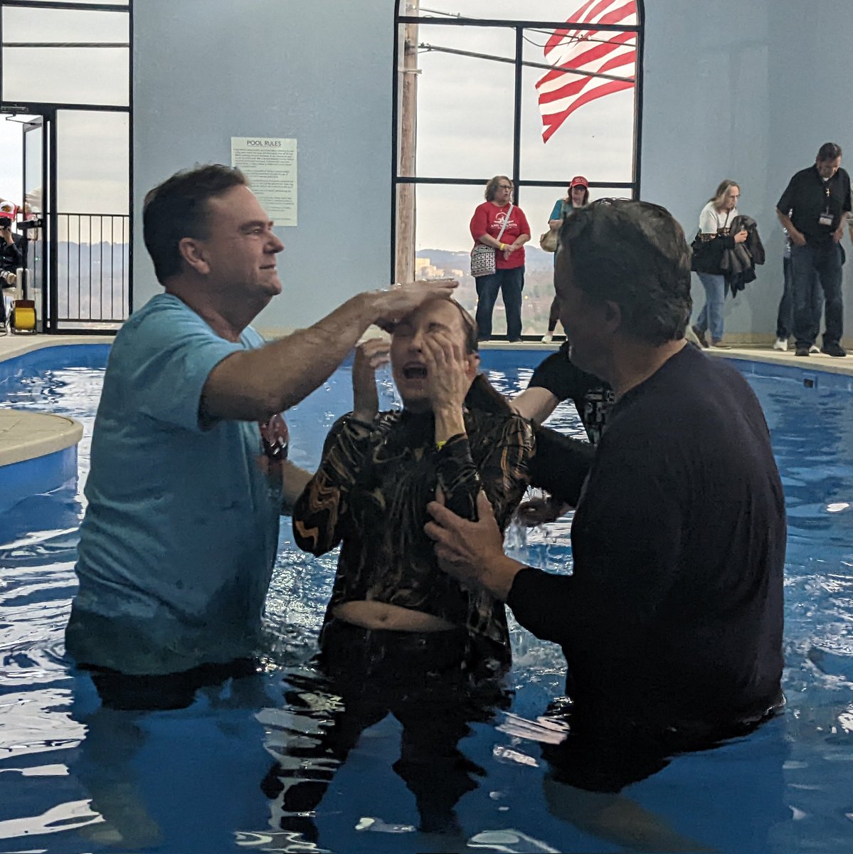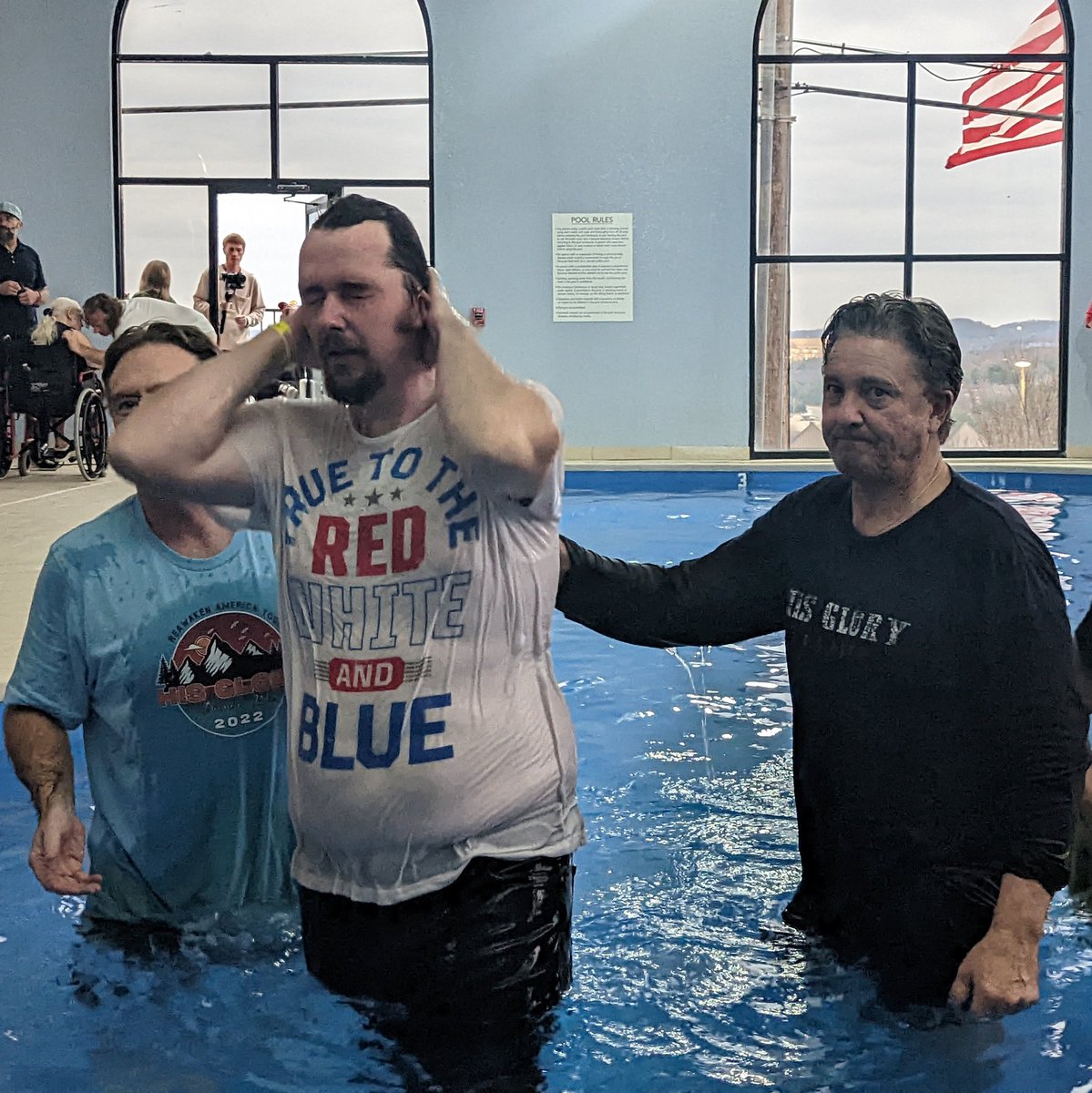 Went to ReAwaken America baptism service (in a hotel pool). New converts to the movement.