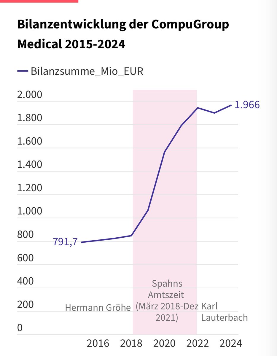 Spahn setzte zu seiner Zeit als Gesundheitsminister zwischen März 2018 und Dezember 2021 politische Rahmenbedingungen. Daraufhin stieg die Bilanzsumme von Gotthardts Firma CompuGroup Medical von 848 Mio € im Jahr 2018 auf knapp 1,8 Mrd € im Jahr 2021. 3/