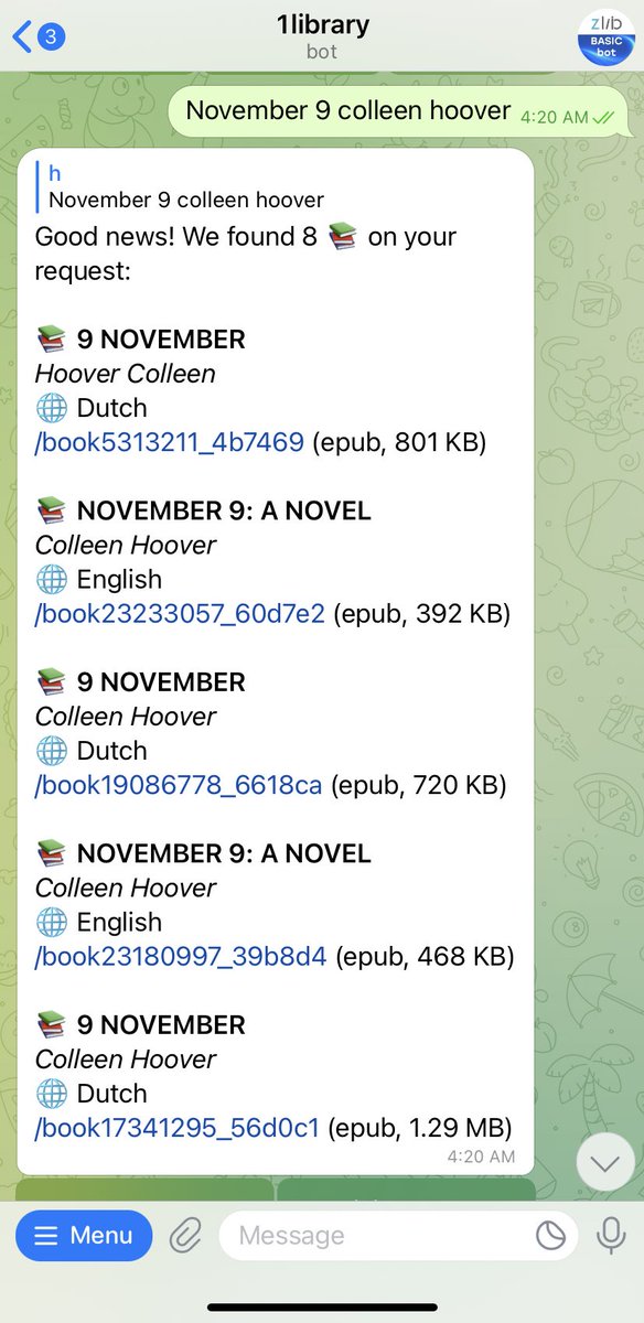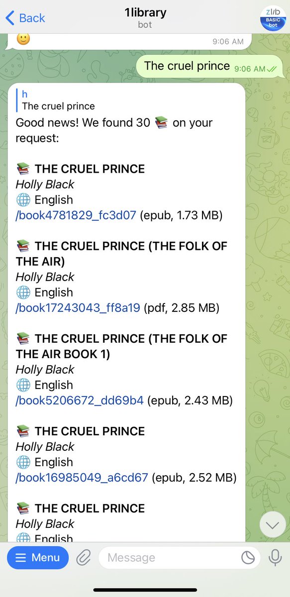 — if you're looking for the zlib bot in Telegram, here it is. i’m not sure if it still works for new users because I saw photos of it being blocked, but you can still try.