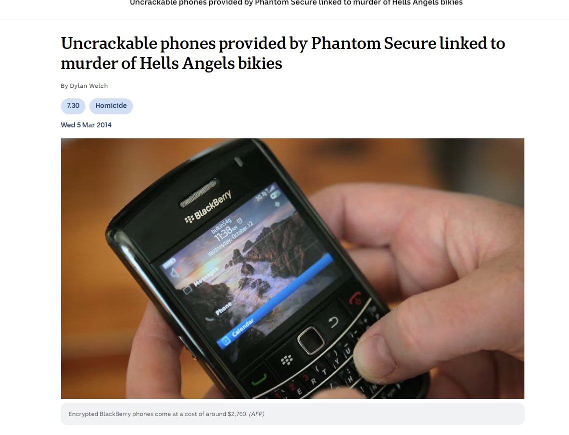 原因是,一次不经意的广告。“Uncrackable phones provided by Phantom Secure linked to murder of Hells Angels bikies,” the headline on a March 2014 ABC article