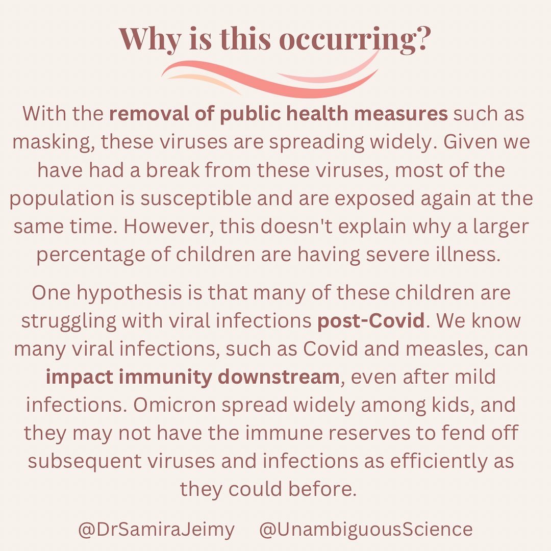 With removal of public health measures such as masking, many viruses are spreading widely. Given we have had a break from these, most of the population is susceptible & exposed again at the same time. But doesn’t explain the higher % of sick kids. (5/8)