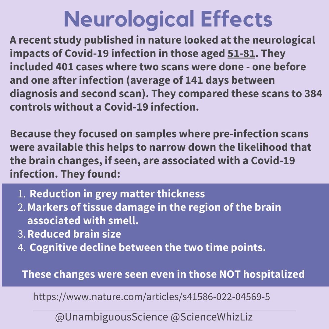 A recent study looked at the neurological impacts of Covid-19 infection in those aged 51-81. They found reduction in grey matter thickness, smell-related markers of tissue damage, reduced brain size & cognitive decline even in non-hospitalized. 3/9 nature.com/articles/s4158…