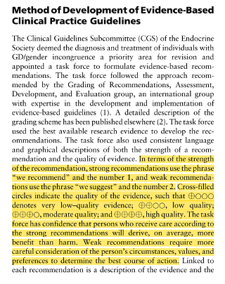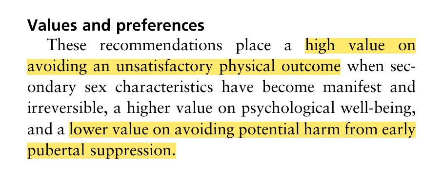 The Endocrine Society (ES) knows the evidence of benefits is of low quality. They also acknowledge the risk of harm. How do they justify their recommendations for hormonal treatments for minors? By placing a higher value on the desired sex appearance than on avoiding harm./12
