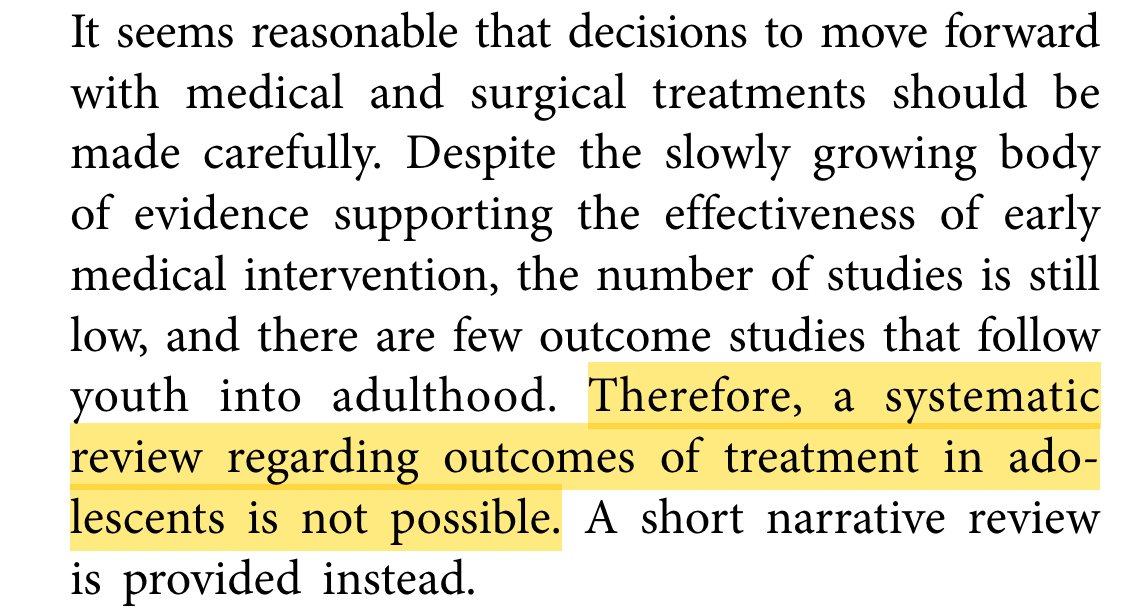 Paradoxically, @WPATH claimed in SOC8 that a systematic review is not possible. This is demonstrably false. Several systematic reviews of evidence of youth gender transition have been conducted in Europe. WPATH itself commissioned a systematic review of evidence for its SOC8./13