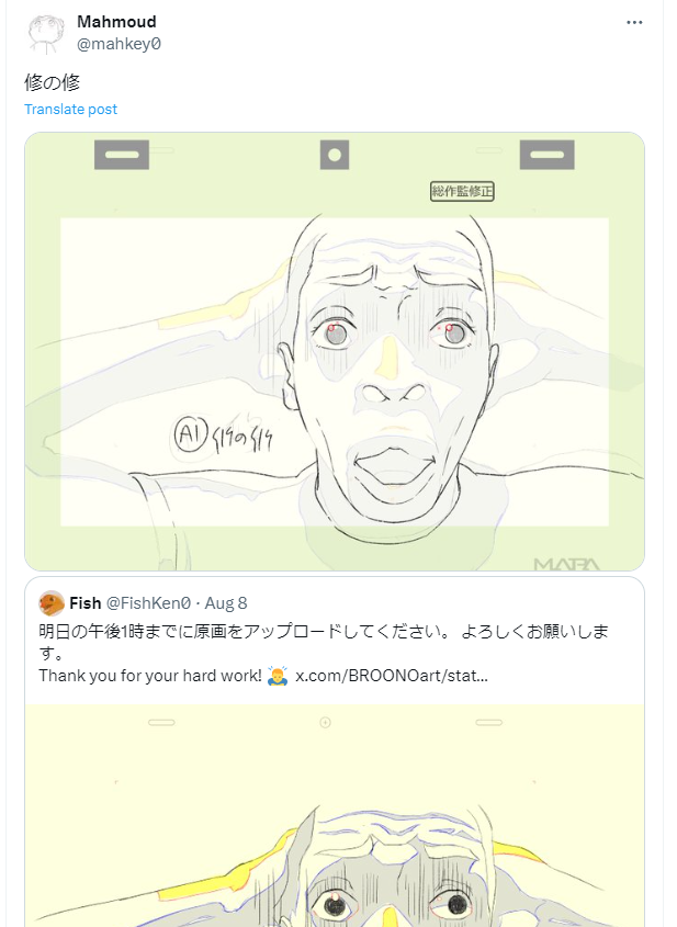 Твит заквотил аниматор FishKen0 с правками режиссёра анимации (сакуга кантоку/саккан), попросил «закончить работу до 13:00 завтрашнего дня».
