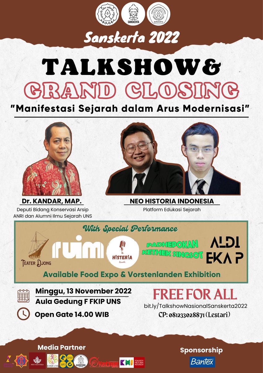 Talkshow Nasional yang terbuka untuk umum dengan judul "Manifestasi Sejarah dalam Arus Modernisasi" ini akan menjadi penanda berakhirnya Sanskerta 2022. Tentunya, grand closing inh akan dimeriahkan oleh pengisi acara yang tidak kalah luar biasa😍✨