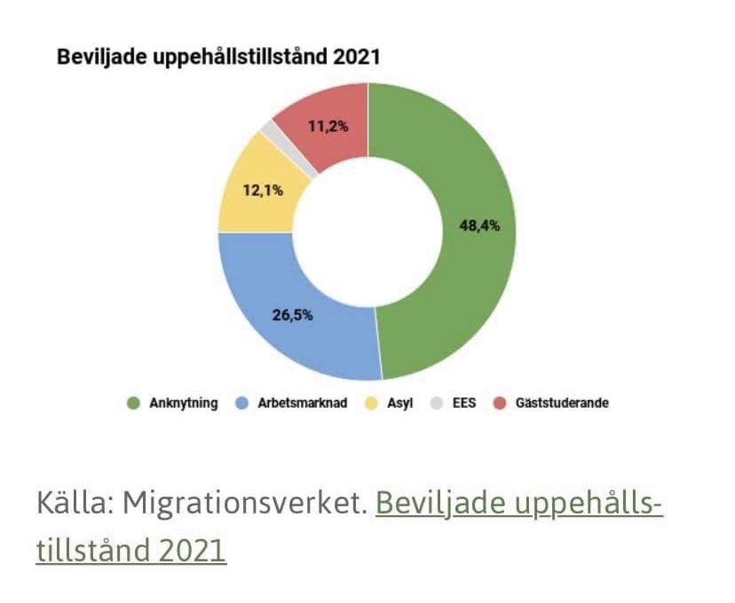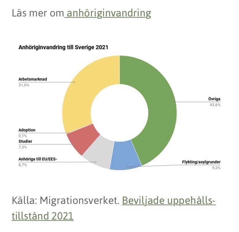FAKTA: 2021 tog vi emot strax över 15.000 flyktingar, inklusive anhöriginvandring och kvotflyktingar. Det är mindre än en fjärdedel av publiken på Friends Arena. Resten är EES, studerande, arbetskraftsinvandring samt övrig anhöriginvandring - som M, KD och L inte har något emot.