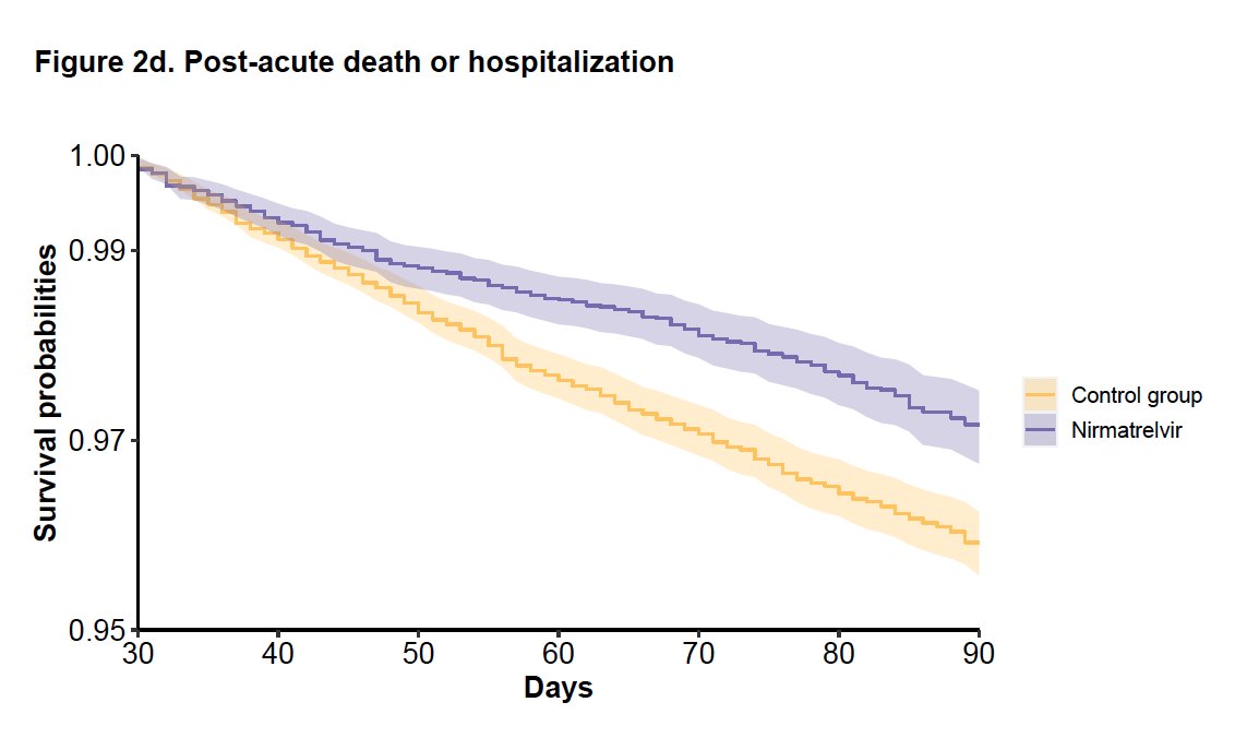 Nirmatrelvir was also associated with reduced risk of post-acute death (HR 0.52 (0.35, 0.77), ARR 0.28 (0.14, 0.41)), and post-acute hospitalization (HR 0.70 (0.61, 0.80), ARR 1.09 (0.72, 1.46)).