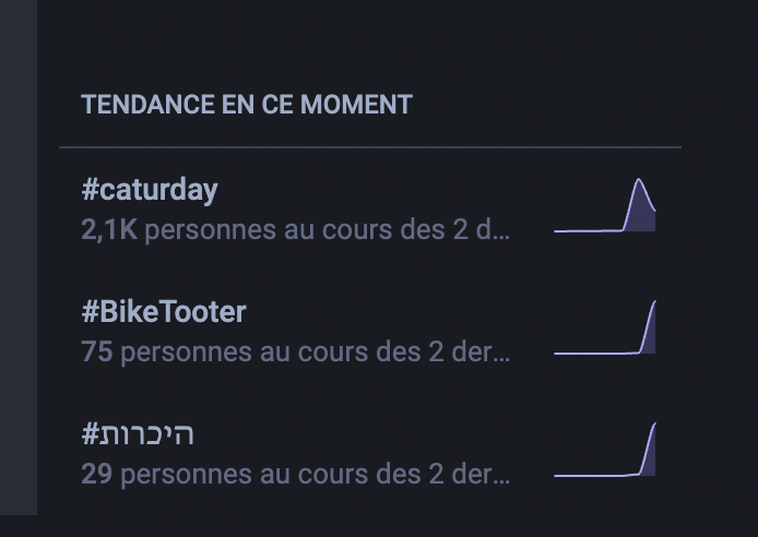 Que dire des tendances aussi ...Pareil aucun filtre sur la langue. Moi qui utilise twitter pour resté proche de l'actu. Autant vous dire que le "caturday" ok. Mais je m'en fou totalement.