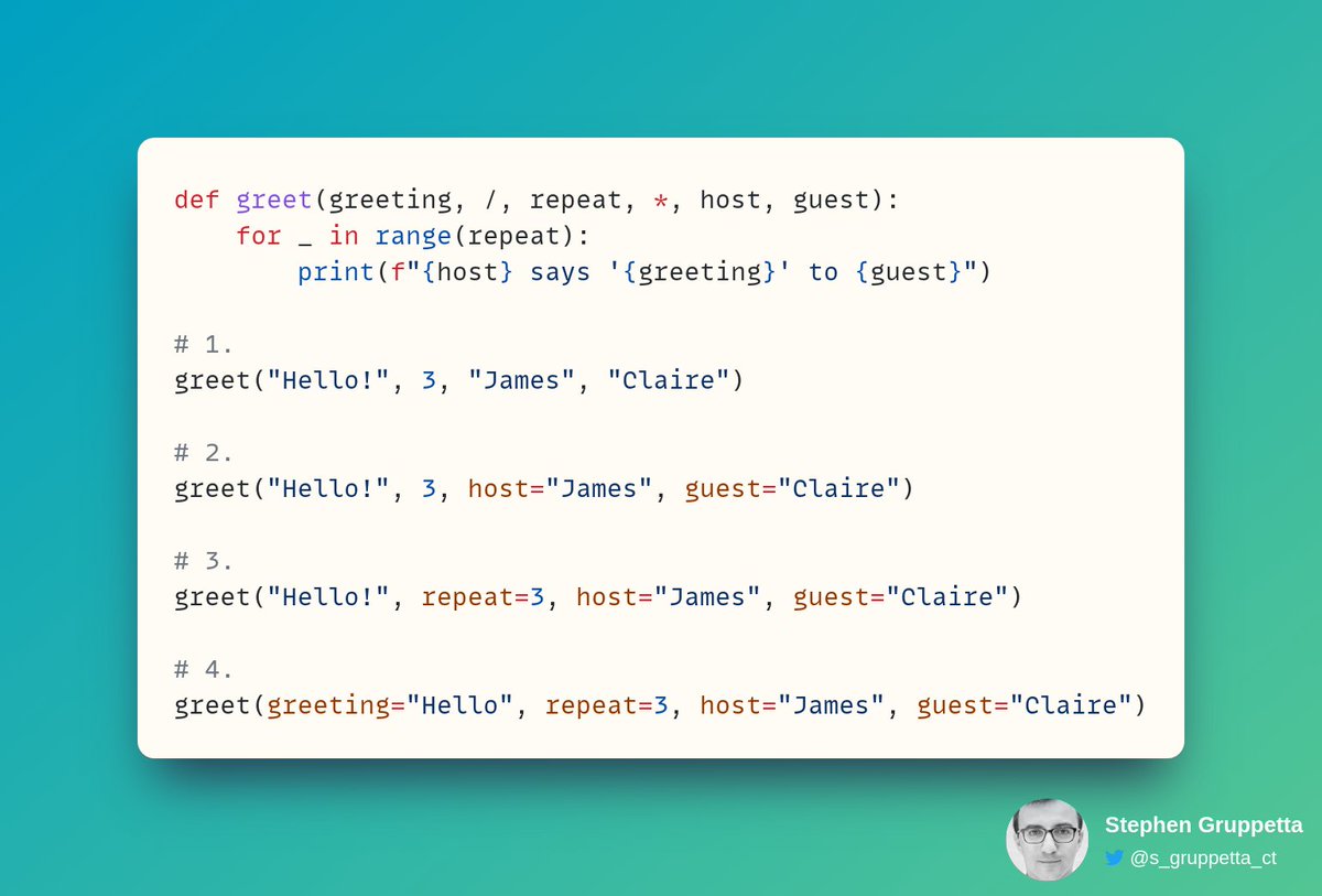 • Using positional-only arguments, or the "rogue" forward slash / in functions