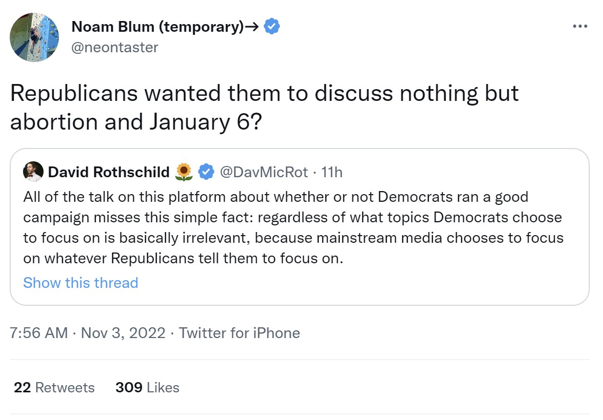 Democratic mistake is not choosing democracy, or abortion, or inflation as main topic, or moving too far to the left or too far to the right: it is all irrelevant because Republicans bully mainstream media and Democrats don't. So mainstream media bends to Republicans. Full Stop.