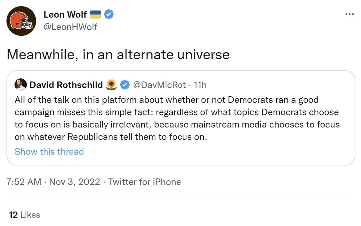 All of the talk on this platform about whether or not Democrats ran a good campaign misses this simple fact: regardless of what topics Democrats choose to focus on is basically irrelevant, because mainstream media chooses to focus on whatever Republicans tell them to focus on.
