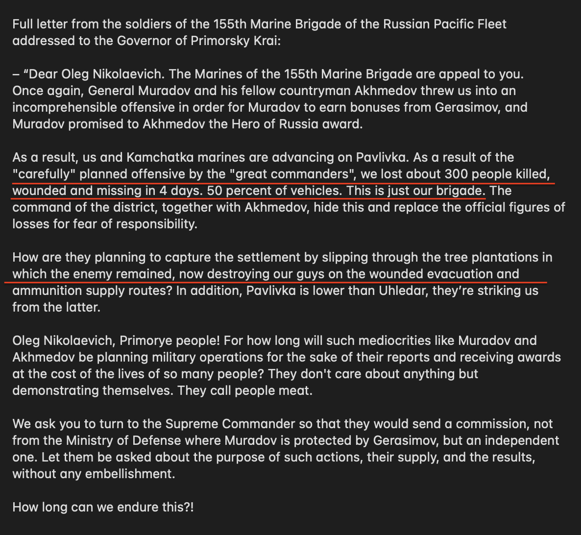 And here is the letter itself from the 155th Marine Brigade that is on everyone's lips today. The brigade was ordered to advance to Uhledar via Pavlivka. They mention 300 casualties (dead and wounded) in just 4 days, and these are marines.