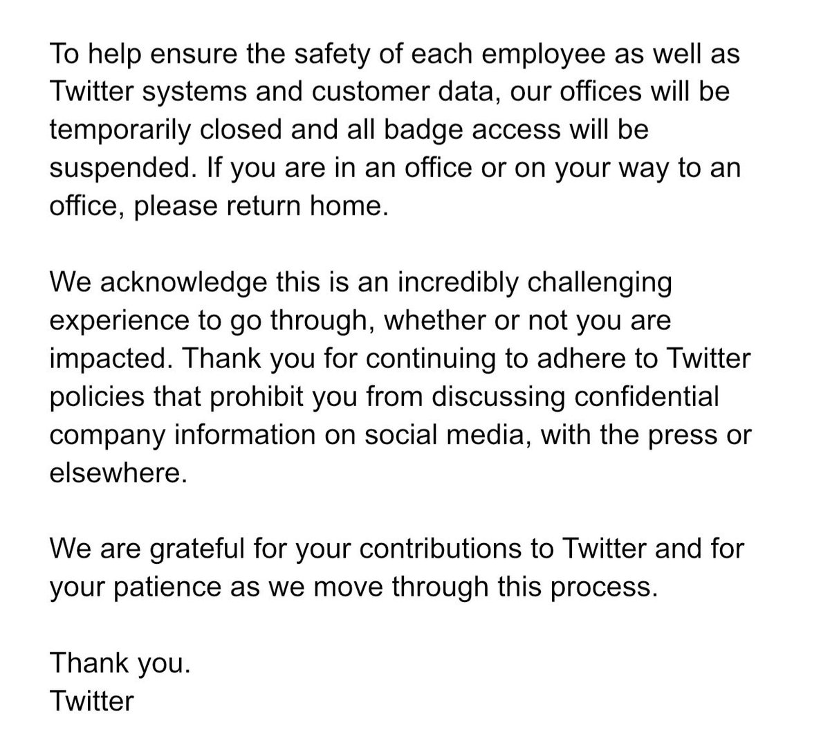 "To help ensure the safety of each employee as well as Twitter systems and customer data, our offices will be temporarily closed and all badge access will be suspended. If you are in an office or on your way to an office, please return home."