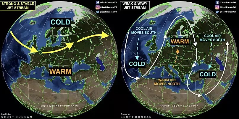 Links ein normaler Jet Stream, rechts so einer, wie aktuell, der weit in den Norden warme Temperaturen ermöglicht, aber auch weit in den Süden kalte polare Temperaturen.