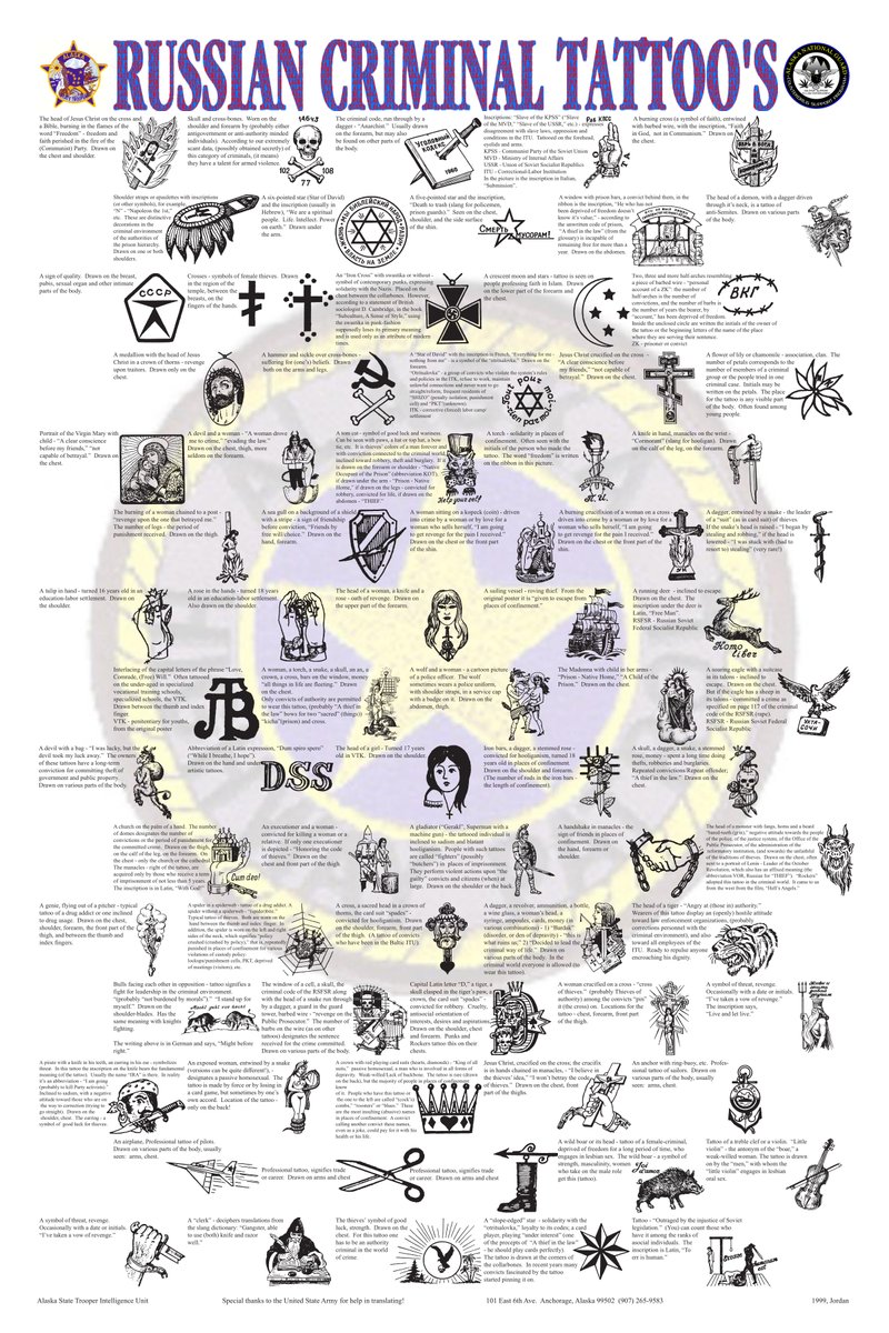 29/ Ps. Tu jako ciekawostka. Tak wyszło, że w tekście się nie złożyło. Znalazłem symbolikę tatuaży rosyjskich przestępców. Dorzucam jako bonus- bo w sumie bardzo to interesujące 😊 Image