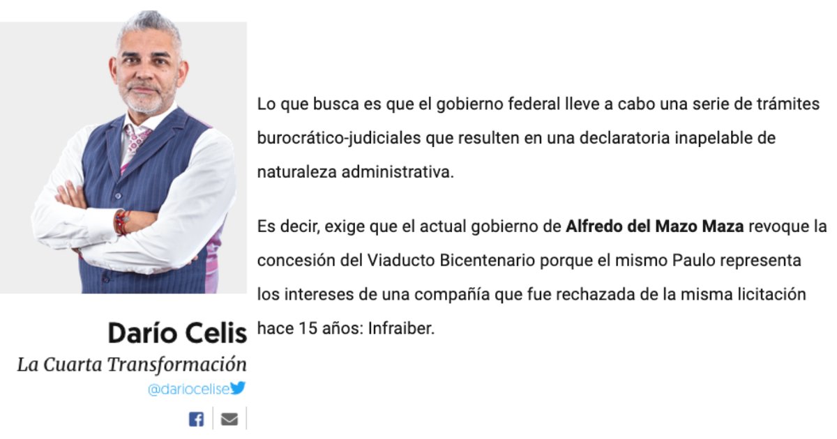 Exige que el actual gobierno de @alfredodelmazo revoque la concesión del Viaducto Bicentenario porque el mismo Paulo representa los intereses de una compañía que fue rechazada de la misma licitación hace 15 años: Infraiber. bit.ly/3fBxGFf