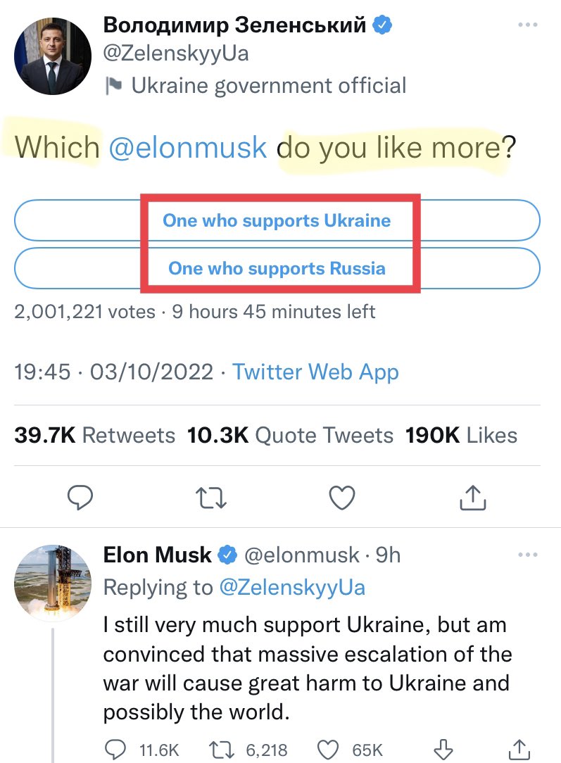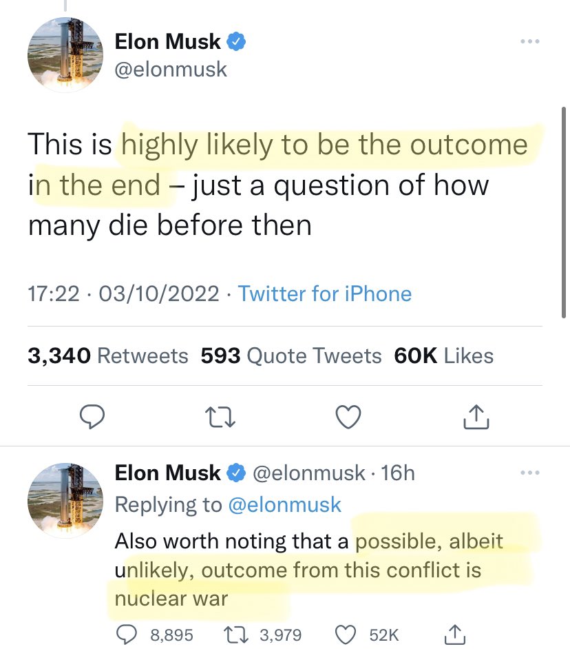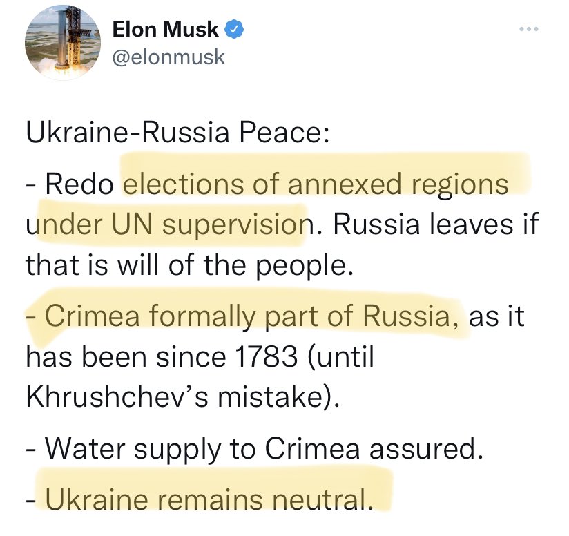 oh look, after being involved in prolonging the war himself by seizing the opportunity to test Starlink in war, Elon Musk concedes that stoking more war in Ukraine is pointless & Ukrainians should have settled for peace that PM Johnson & British establishment previously vetoed