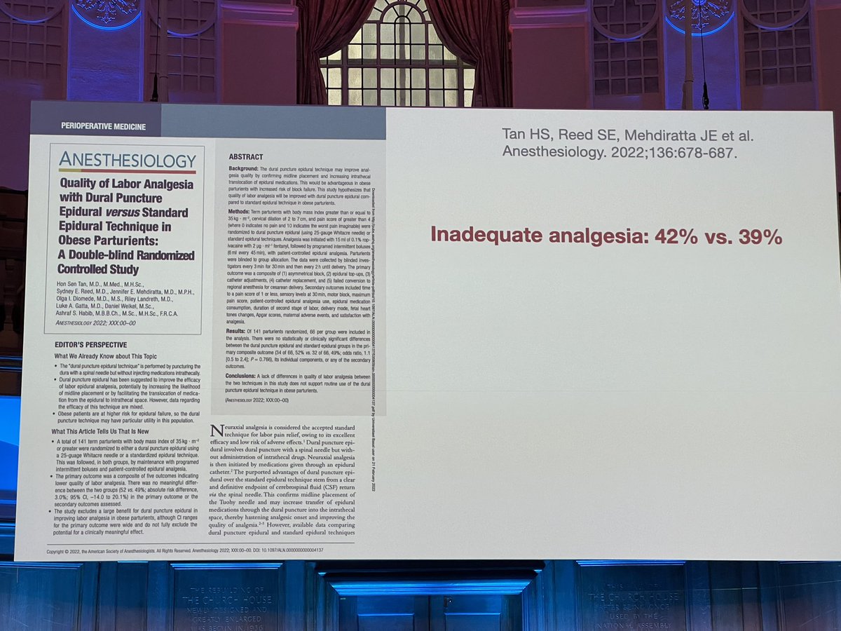 @ashrafhabib5’s group, also @_Anesthesiology, found no advantage 4 DPE. Heesen et al, in @IJOA_Journal, found less epidural top ups, shorter onset (is this clinically relevant?) & better sacral analgesia. Of note, failed DO in 1/8 patients - wonder if epidural worked? #OAA3dc2022
