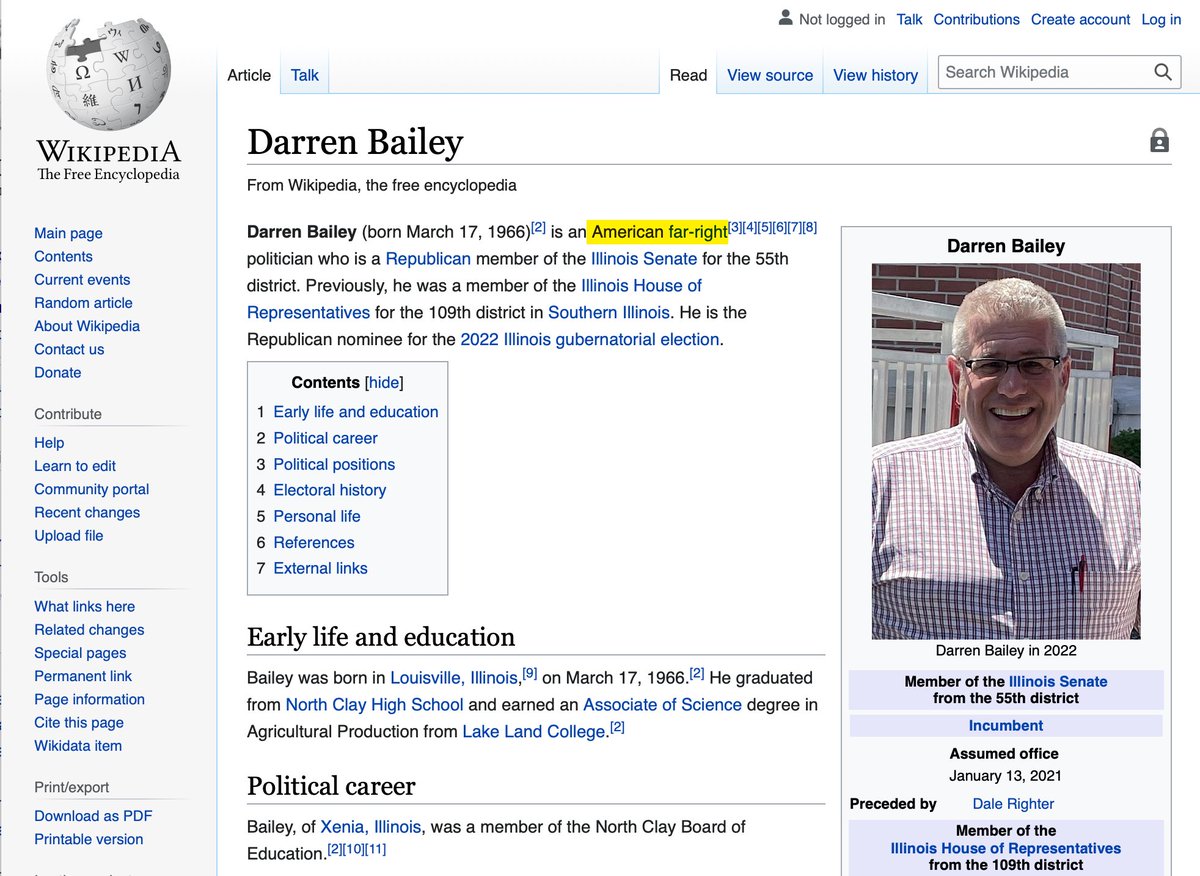 Wikipedia has become a joke. Main evidence cited for why the GOP gubernatorial nominee in Illinois is "far-right" -- he "supports a statewide ban on abortion except in cases where the mother's life is in danger." Disagree all you want, but that's just a mainline GOP position