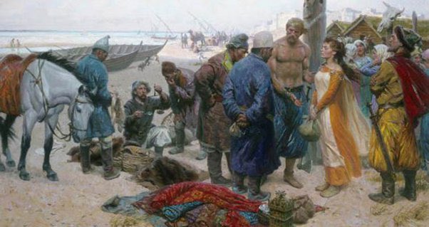 The first Norsemen to reached the southern shores of the Caspian, which they named Serkland (Saracen Land), were traders. These men travelled the river systems that connected the Baltic to the Caspian Sea, trading slaves, furs, amber & ivory for silks, jewelry, spices, & coin.