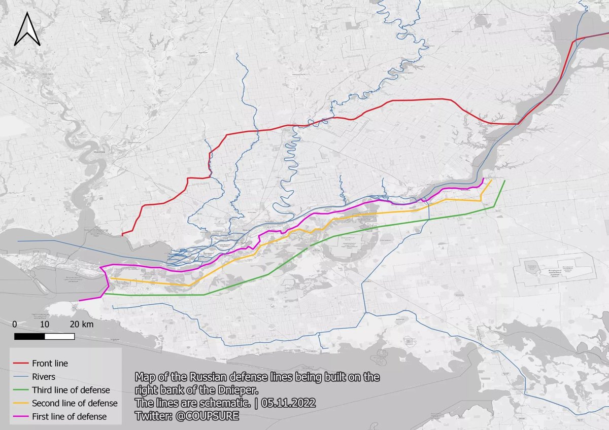 Russia is preparing a multi-layered defense on the east bank of the Dnipro in occupied Kherson Obl, satellite images analyzed by @coupsure show