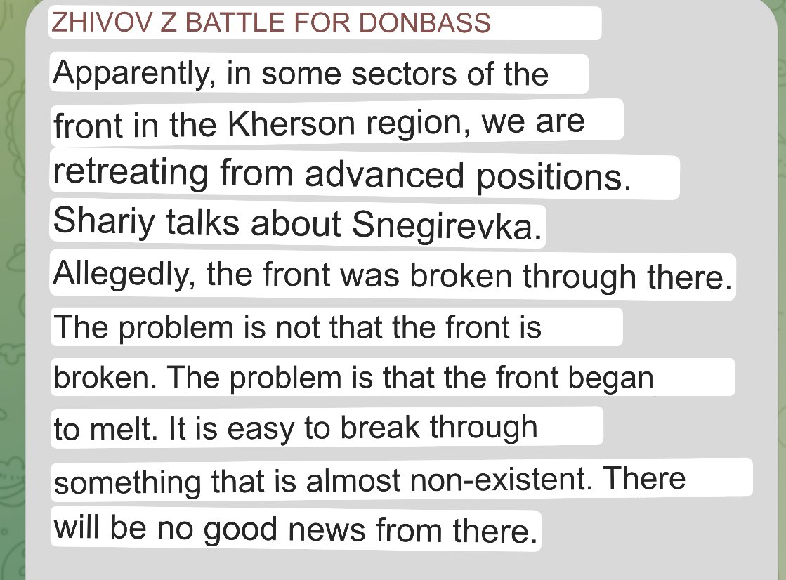 I have started including some reports form Wargonzo, their daily morning report seems to be fairly accurate, but don't look at the maps. Their Kherson map is either way off, or Russia lost a huge chunk of territory. My bet is on option 1.