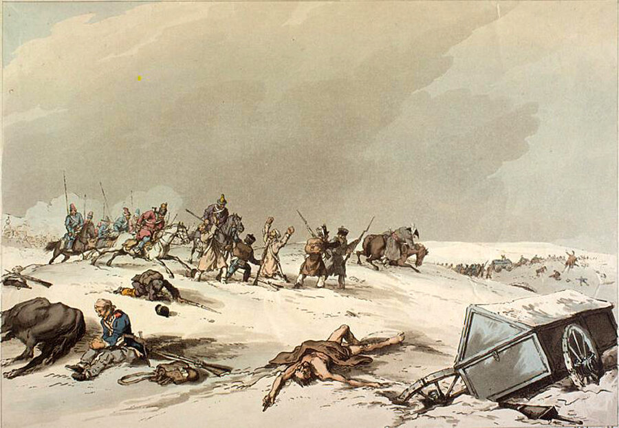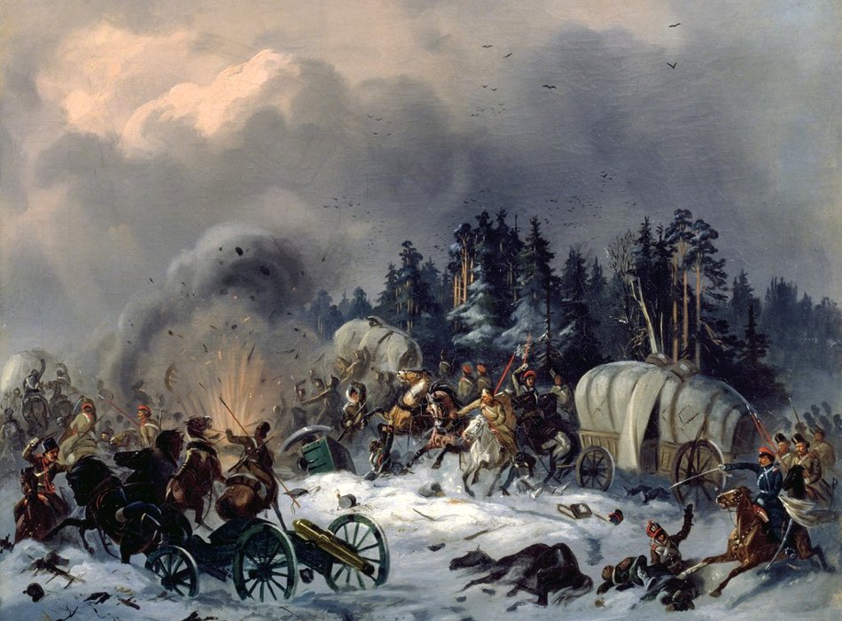 The chaos, amplified by "the most savage cries" of the enemy, instantly dissolved Eugene's aura over his soldiers. They hastily spiked their guns and threw away their loots and even the meager amount of food they had, reducing themselves to "fugitives from Moscow." (Thiers)