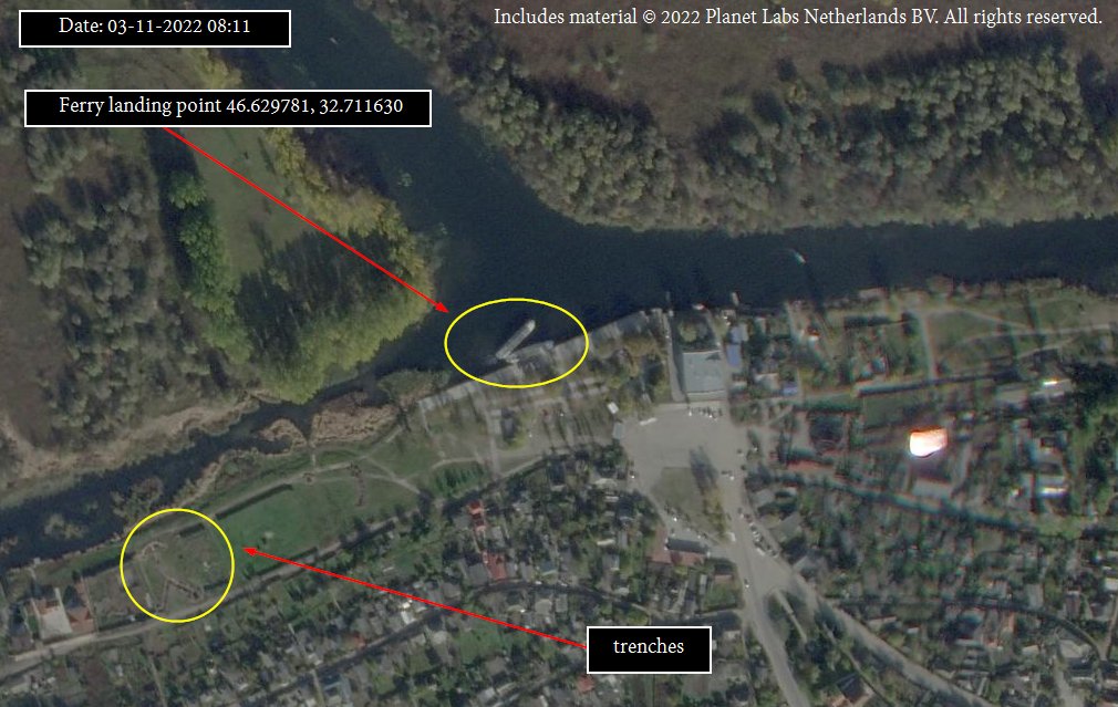 3/12 In the kherson city area, there were 3 main ferry points, one is located near the Antonovskyyi railbridge near Pridniprovsky, near the ferry loading site, mil. vehicles could be seen waiting the last couple of days. a bit further away 🇷🇺 established a rallypoint.