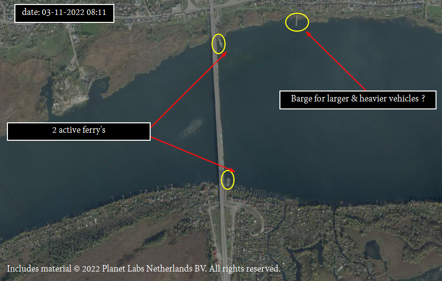 2/12 These ferry's and multiple barges have been operating continuesly, first there objective was to supply troops on the west-side of the river, since last week that changed, we have seen columns of vehicles move the other direction.