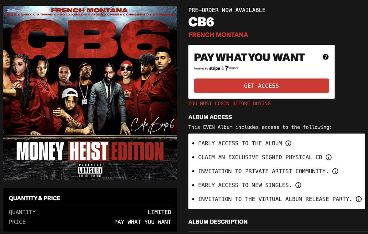 EVEN is a platform for artists to launch pre-release NFT drops for albums.