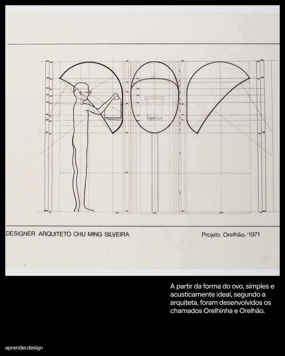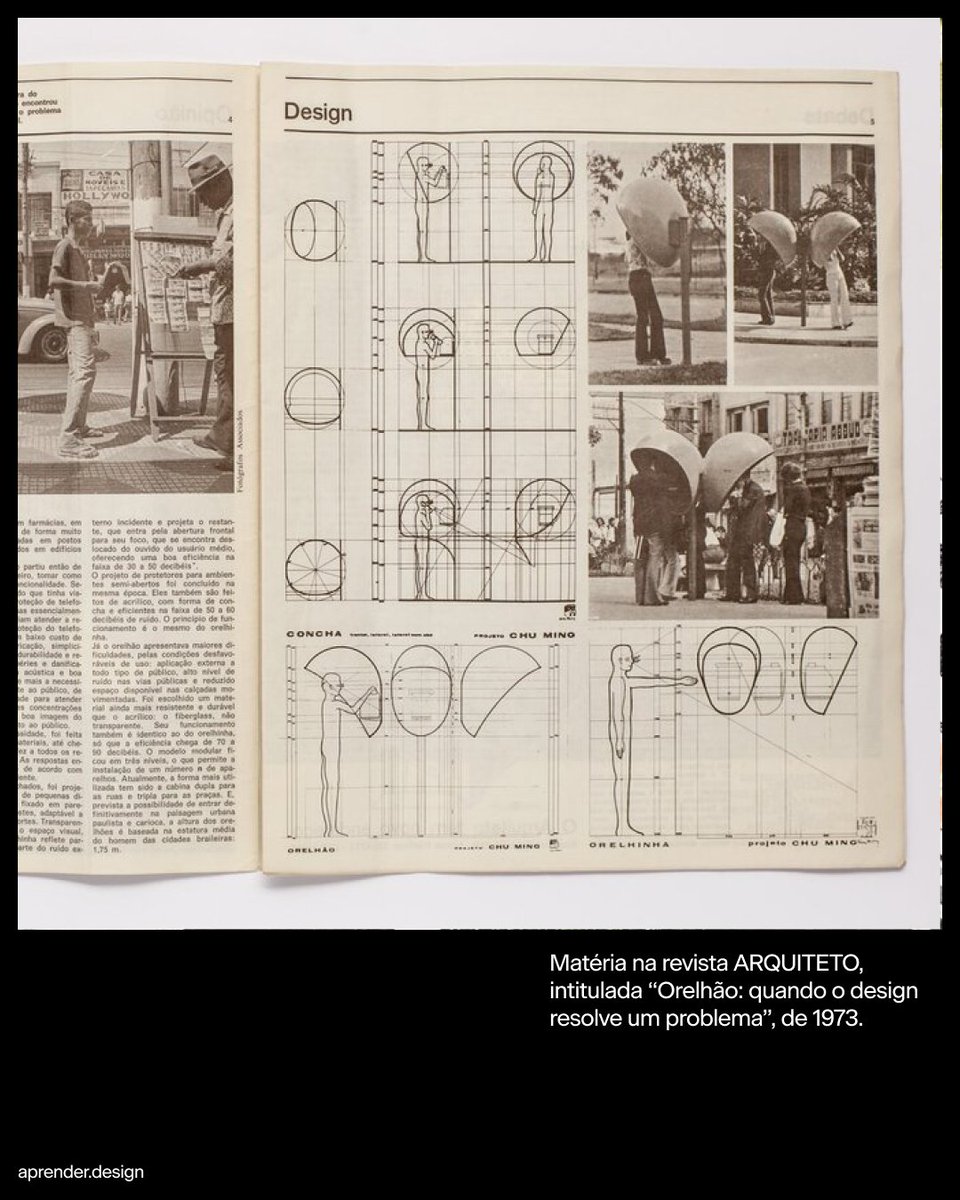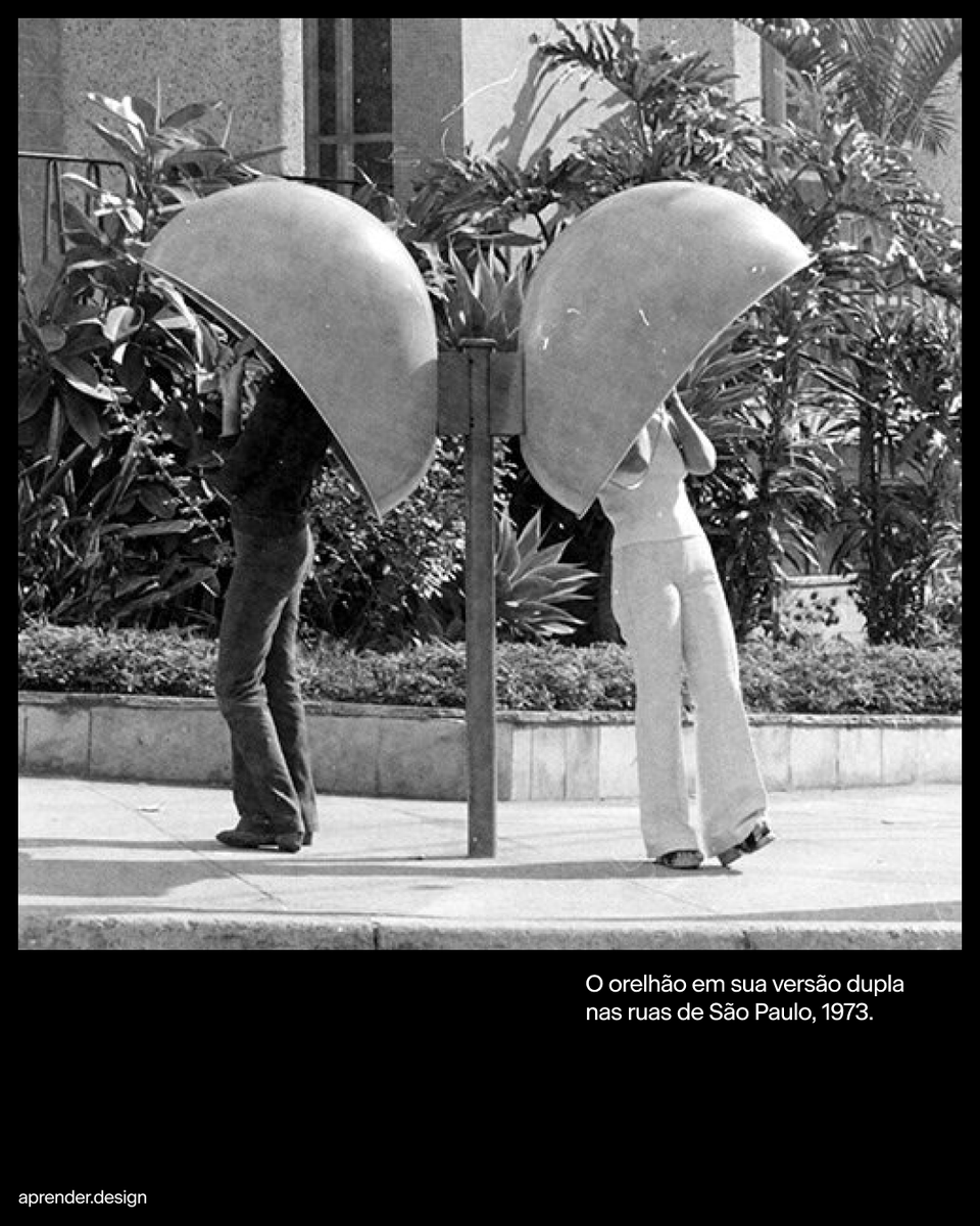 Ela desenhou três modelos: o Orelhinha, para ambientes fechados, a Concha, para espaços semi-abertos e o Orelhão, para espaços abertos.