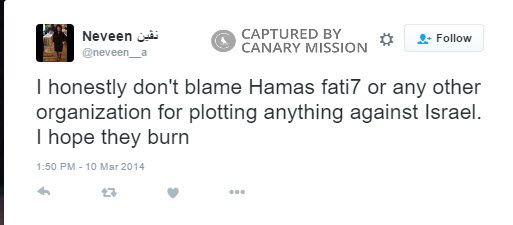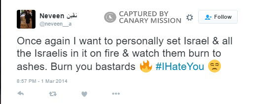 Unsurprisingly, the SJP chapter’s primary contact, Malak Afaneh, has a history of demonizing Zionists. canarymission.org/individual/Mal…