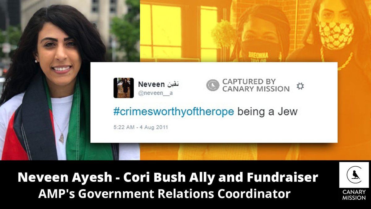 1/ .@CoriBush Fundraiser and friend, Neveen Ayesh has been the Government Relations Coordinator for the @AMPalestine chapter in St. Louis, Missouri since 2018. She has expressed a SHOCKING hatred of Jews. canarymission.org/individual/Nev…