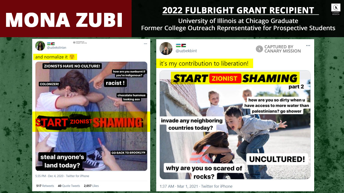 1/ It is appalling that @UICnews grad Mona Zubi received a @FulbrightPrgrm award after spending her college years encouraging her peers to "harass" and "shame" Zionist students on campus and engaging in harassment herself. canarymission.org/individual/Mon…
