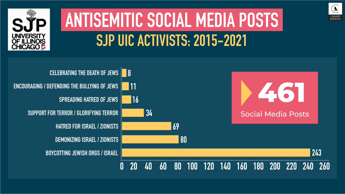 3/ @canarymission 's 2021 investigation of @SJPUIC revealed alarming antisemitism including: 1. A campaign to malign Chicago’s largest Jewish charity 2. Bullying of “Zionists” 3. 461 social media posts spreading antisemitism, terror support & Israel-hatred canarymission.org/campaign/SJP_U…