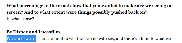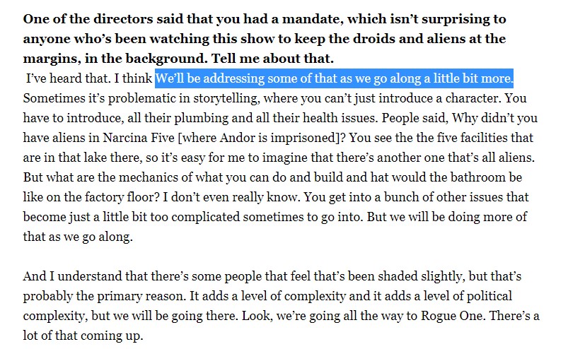 Also, good to see that Gilroy is aware of how the lack of aliens (and, I suppose, droids) comes across and that it won't be this way forever.